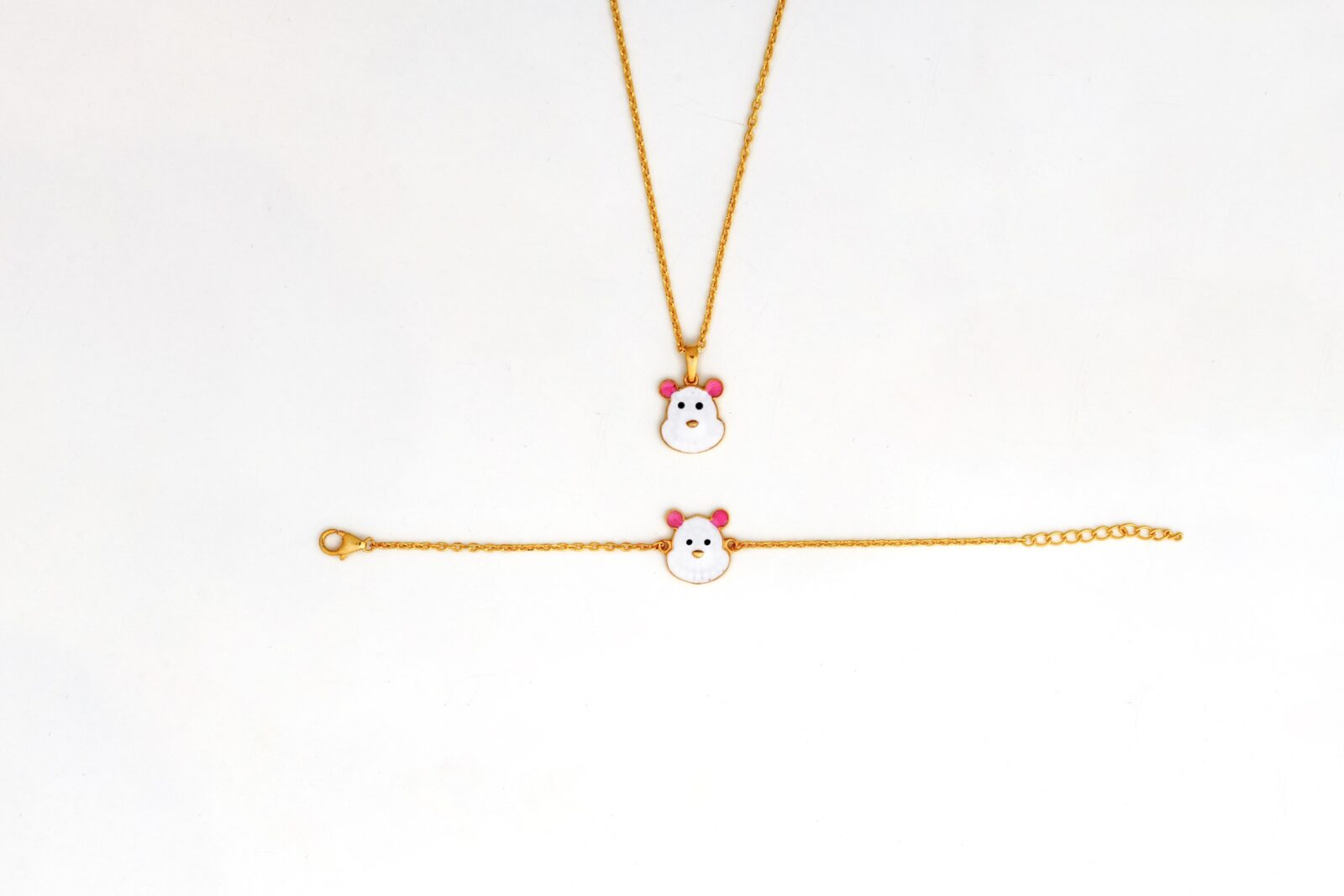 This is a cute silver jewellery set consisting of a pendant necklace and a matching bracelet. Both pieces feature a small bear-face charm with a white enamel finish and pink ears, set on a sleek golden chain.