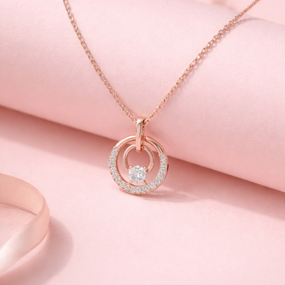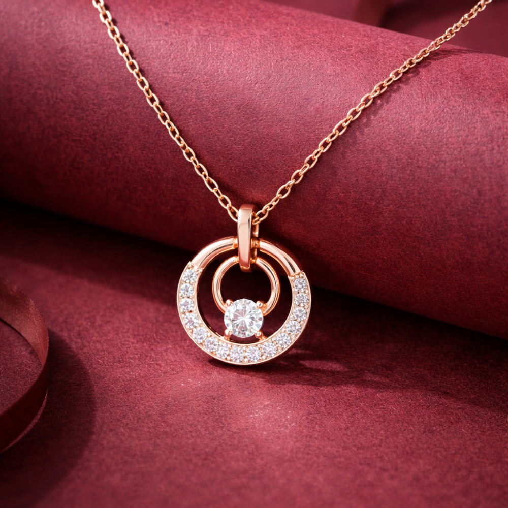 The Wamikaa 925 silver rose gold necklace features a refined circle design with a sparkling CZ center. Its balanced shape and warm finish make it easy to style every day.