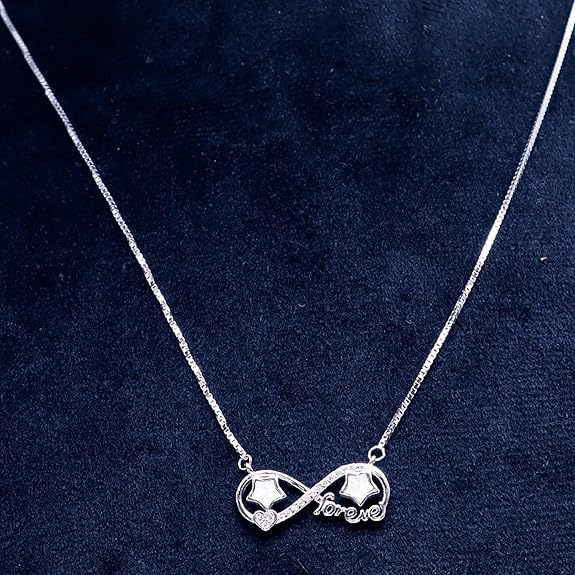 The WAMIKAA Premium 92.5 Silver Infinity Forever Pendant is a beautifully crafted piece of jewelry that symbolizes eternal love and timeless elegance. Made from high-quality 92.5 sterling silver, this pendant features a delicate infinity symbol that represents an unbreakable bond, making it the perfect gift for someone special or as a personal keepsake. The sleek, polished design of the pendant is both modern and sophisticated, making it suitable for any occasion—from everyday wear to formal events. This Infinity Forever-shaped Necklace comes with a finely crafted pendant that can be easily paired with a variety of chains, offering versatility in styling. Its refined design and premium silver composition ensure durability and a long-lasting shine, making it an ideal choice for women and girls who appreciate fine craftsmanship and timeless beauty. Whether worn as a symbol of love, friendship, or personal commitment, this pendant makes a meaningful and stylish accessory. Elevate your jewelry collection with the WAMIKAA Premium 92.5 Silver Infinity Forever Pendant, a piece that exudes both grace and significance.