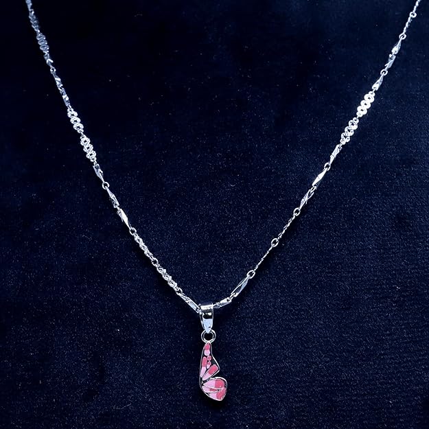 The WAMIKAA Premium 92.5 Silver Pink Butterfly Wings Pendant is a delicate and vibrant piece that symbolizes transformation, freedom, and beauty. Crafted from high-quality 92.5 sterling silver, this pendant features a stunning pink butterfly wings design, offering a playful yet elegant touch to your jewelry collection. The soft pink color enhances the graceful design, making it a perfect combination of nature-inspired beauty and sophisticated style. This Pink Butterfly Wings-shaped Necklace is lightweight and comfortable, designed to be worn all day while adding a touch of charm and color to any outfit. Whether you’re looking to express your individuality, celebrate a personal transformation, or give a thoughtful gift, this pendant is an ideal choice. It’s perfect for girls and women who appreciate unique, meaningful jewelry with a modern twist. Whether paired with casual attire or evening wear, the WAMIKAA Premium 92.5 Silver Pink Butterfly Wings Pendant is a stunning accessory that evokes feelings of freedom and the beauty of new beginnings. Perfect for everyday elegance or special occasions, this pendant adds a touch of whimsy and grace to any ensemble.